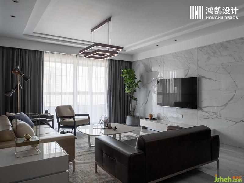 設(shè)計公司利用簡潔的家具,別致的吊燈、落地?zé)?,讓這個客廳有種低調(diào)的奢華感。