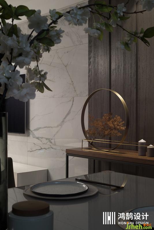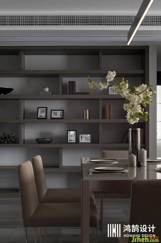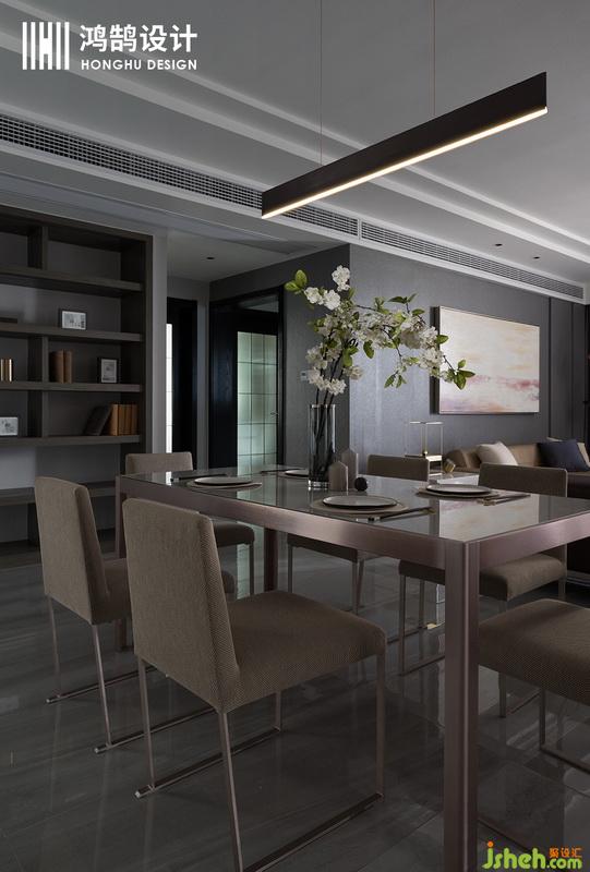 金屬質(zhì)感的餐桌和搭配極負(fù)考究的餐椅,顯得格調(diào)高雅,營造了一種靜謐的氛圍。