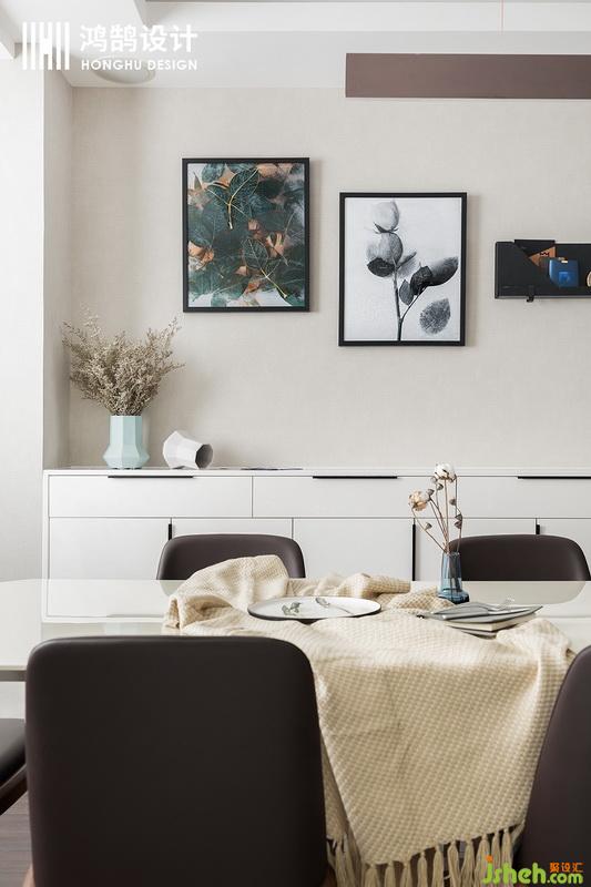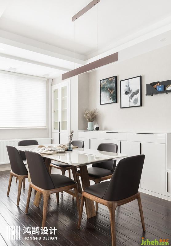 餐廳的整體布局,貫穿客廳,室內(nèi)設(shè)計師以白色氛圍為主,加上深咖色桌椅進行調(diào)劑,讓就餐氛圍既輕松,又有儀式感。