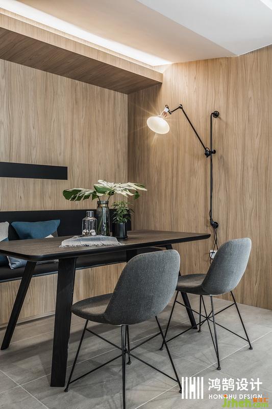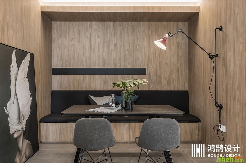 室內(nèi)設(shè)計(jì)師將餐廳設(shè)計(jì)成卡座,木飾面的墻面與線條清晰的餐桌相呼應(yīng),使整體視覺(jué)更融洽,一種簡(jiǎn)約質(zhì)樸之感。