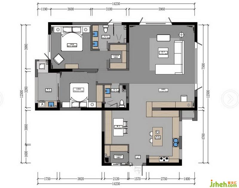 這個(gè)看起來(lái)很大的房子其實(shí)只有140平方,通過(guò)戶型的改造室內(nèi)設(shè)計(jì)師把原來(lái)的廚房做成了入戶衣帽間與餐廳,把原來(lái)北邊的小房間做了現(xiàn)在的超大的敞開式廚房,讓空間更加開擴(kuò)與通透。把原來(lái)客廳與餐廳的空間做了一個(gè)整合,做成現(xiàn)在一個(gè)非常開闊的客廳和敞開式書房的結(jié)合。