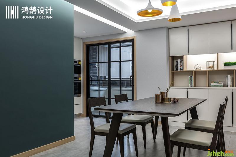 客廳與餐廳相連,開放式的餐廳的設(shè)計(jì),擴(kuò)大動(dòng)線區(qū)域,木飾面上墻使得整個(gè)空間有了延伸性。