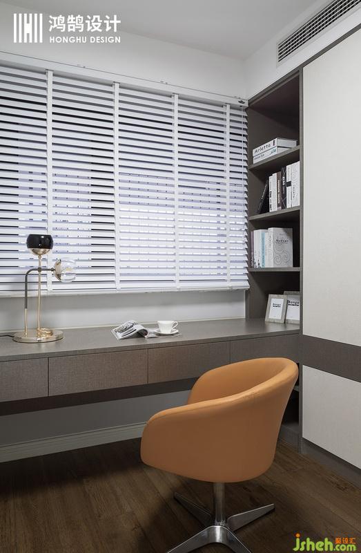 書房設(shè)計(jì)公司沿用了整體風(fēng)格的主基調(diào),選用比較節(jié)省空間的定制書桌,與書柜相連,提升設(shè)計(jì)感的同時(shí)也讓空間利用率變高。