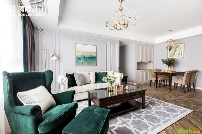 用絲絨墨綠色的沙發(fā)點綴整個空間,加上金屬質(zhì)感的吊燈,輕奢氛圍蔓延開來。