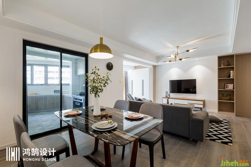 黑色的大理石臺(tái)面的餐桌和金色的金屬吊頂燈,讓空間沉穩(wěn)大氣不失優(yōu)雅和精致。