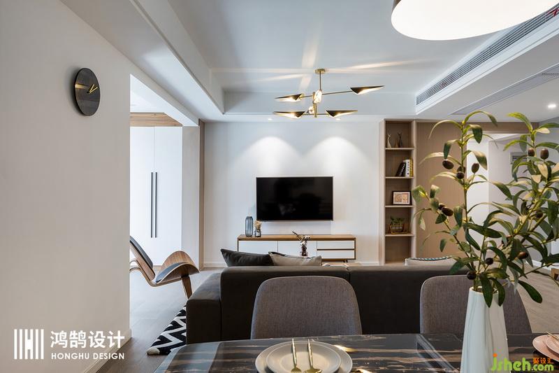 回字形造型吊頂使客廳更加開闊、立體,淺木色的飾面板作為電視背景墻與灰色的沙發(fā)形成了很好的色彩融合,把客廳的整體氛圍營(yíng)造的溫馨舒適。
