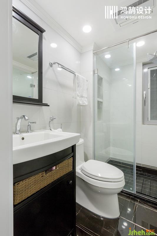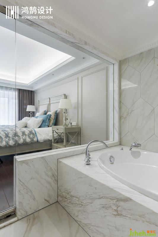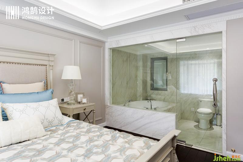 用了透明的玻璃材質作為主臥衛(wèi)生間的隔斷,讓光線無阻擋的照進整個房間,使得房間更通透。