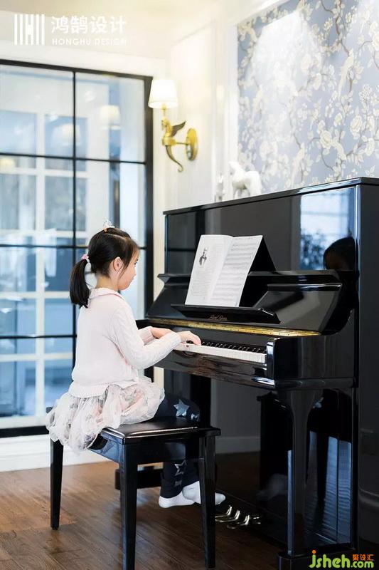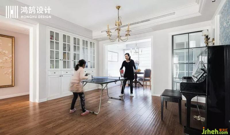 這個(gè)活動(dòng)室是本案的亮點(diǎn)之一,設(shè)計(jì)公司將原餐廳的大空間 放置著乒乓桌和鋼琴 ,形成親子互動(dòng)的親密空間 ,大面積的暖色乳膠漆從墻面一直刷至頂面線(xiàn)條處 拉升了整體空間的層高。這樣的設(shè)計(jì)也是女主的要求,她希望陪伴女兒的每日的成長(zhǎng),讓家里多些孩子的足跡。