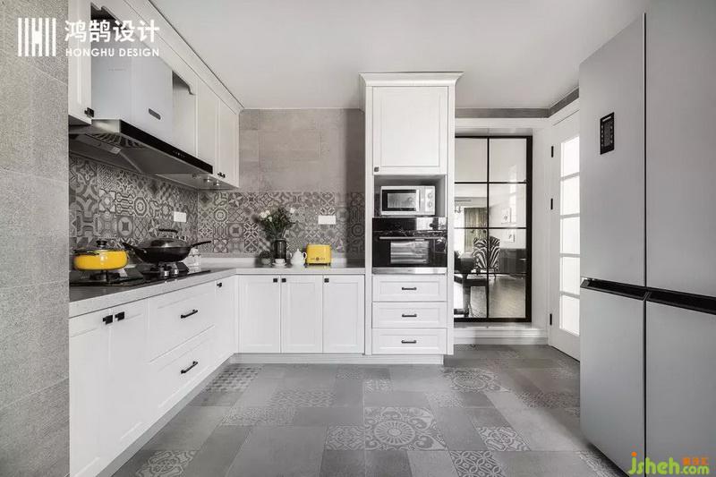 花磚上墻與地磚相呼應(yīng),白色櫥柜與灰色相配,使得整個(gè)廚房空間也變得整潔與高品質(zhì)。