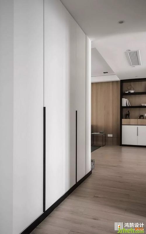 進(jìn)門處亮點是設(shè)計了雙玄關(guān)。進(jìn)門左側(cè)外玄關(guān)作為鞋柜使用;內(nèi)玄關(guān)則作為儲物柜,柜子門板是品牌商根據(jù)尺寸定制,在保證高度的同時不會變形。內(nèi)外玄關(guān)相互呼應(yīng),方便進(jìn)出使用,同時也增加了儲物空間。