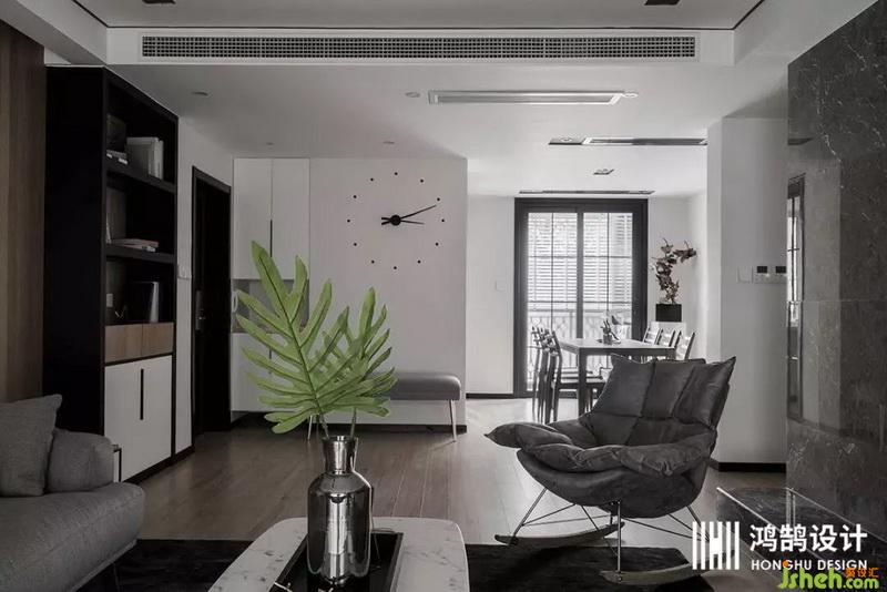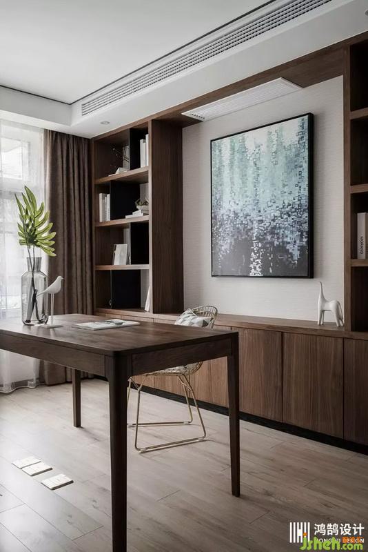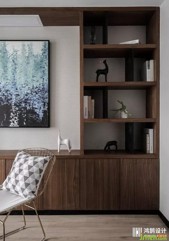 對于書房空間,業(yè)主原先的想法是讓室內(nèi)設(shè)計師打造一塊可以讓客人休息的區(qū)域。本案室內(nèi)設(shè)計師認(rèn)為書房應(yīng)該作為一個獨立的個體所在,所以并沒有建議這么改造。書房墻面做了一整面的書柜,中間空出一塊區(qū)域放置裝飾畫,不會讓整面書柜顯得特別死板;書柜并非成品定制,而是木工師傅現(xiàn)場打造出來的,采用的是顏色較深的胡桃木,并且使用黑色木板打造一個錯層的隔斷,視覺上更加豐富。除了柜體之外的墻面,并沒有使用木飾面上墻,而是貼了一整面墻紙,與地板顏色區(qū)分開來。