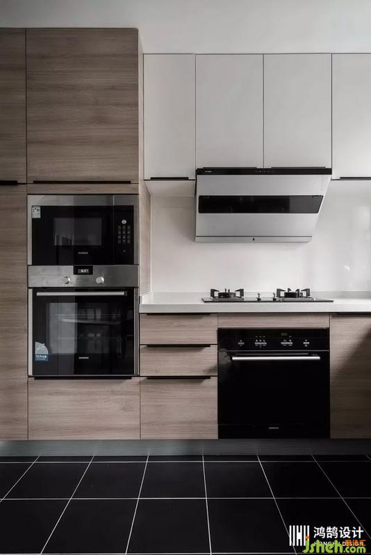 廚房門板的顏色與房屋整體的木飾面顏色是統(tǒng)一的,包括所有柜體的門把手都是黑色鐵藝材質(zhì),再次強(qiáng)調(diào)了整體風(fēng)格的統(tǒng)一性。廚房地面室內(nèi)設(shè)計師采用了黑色啞光的瓷磚鋪貼,與部分柜體和電器相互呼應(yīng),顯得更加沉穩(wěn)有格調(diào)。