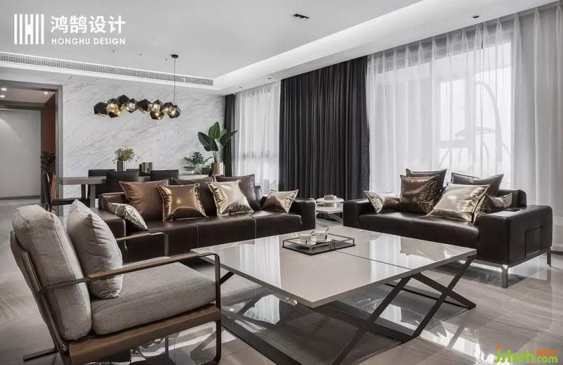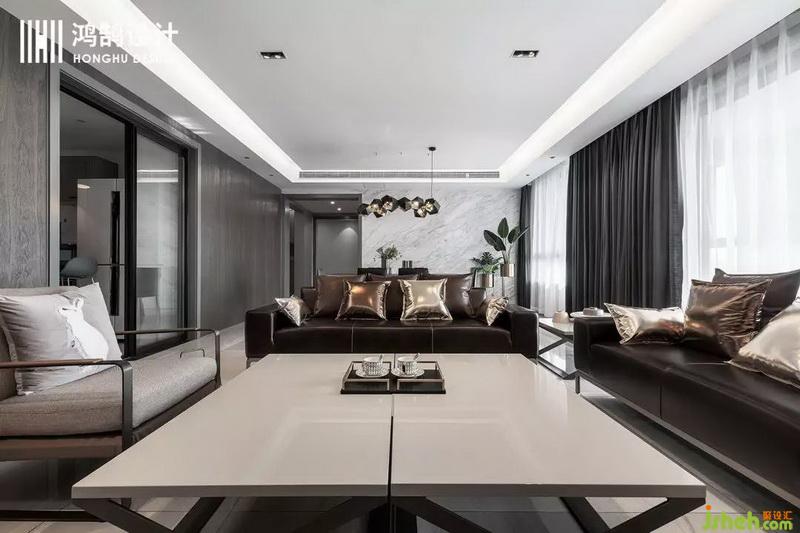 餐廳與客廳相連,空間開闊,整體設(shè)計公司以棕色為主色調(diào),搭配黑色木紋以及白色大理石,讓整體變得現(xiàn)代且具有品質(zhì)感。