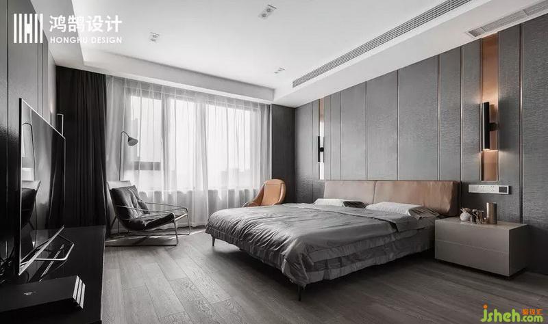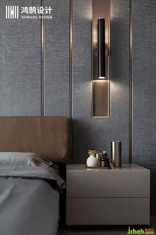 主臥室是一個通長的比較開闊的臥室跟書房空間,在就寢區(qū)設(shè)計公司采用三邊圍合的床背景來劃分區(qū)域讓人有安全感,用材上采用了深色硬包增加臥室的神秘感,用金色的金屬點(diǎn)綴提升空間層次和質(zhì)感。