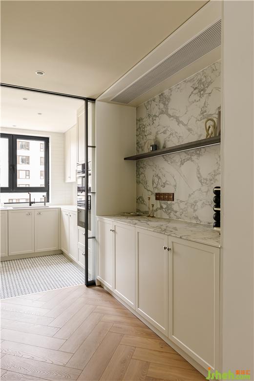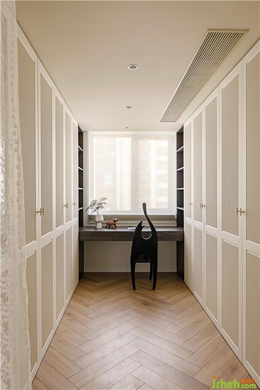 衣帽間運(yùn)用拱形門+金屬質(zhì)感的拉手五金,家裝設(shè)計營造了一份獨有的法式優(yōu)雅;同時在柜體的材質(zhì)選用了模壓板,帶線條的層次,衣帽間多了幾分莊重。