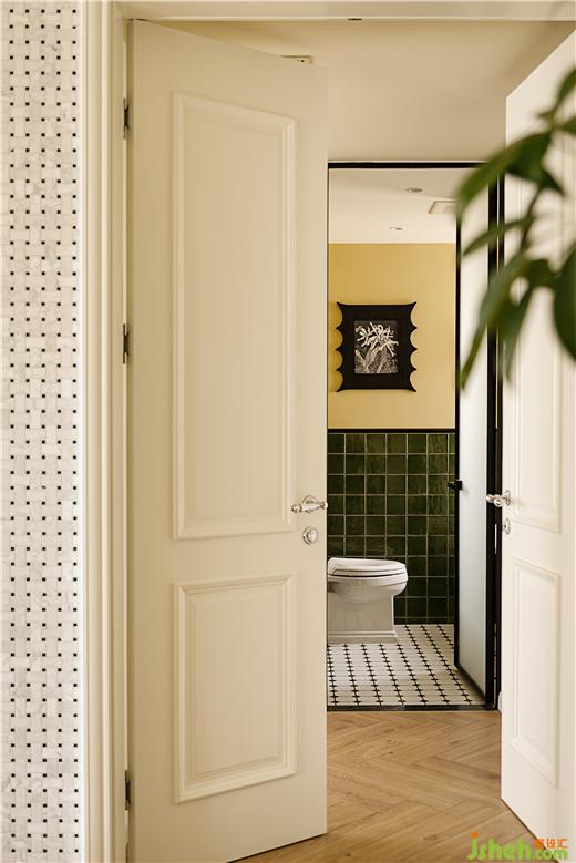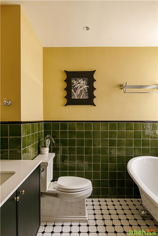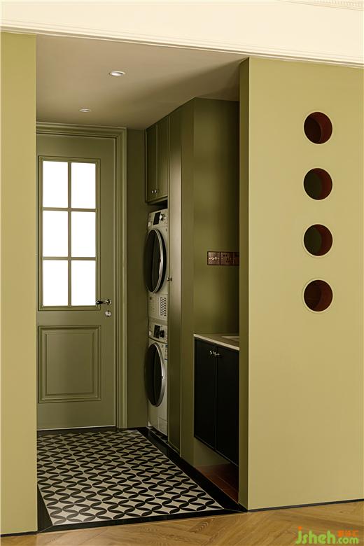 干區(qū)作為客廳的“一部分”,延續(xù)橄欖綠和黑色的組合,在花色上注重復(fù)古的質(zhì)感,滿足日常洗手以及洗衣的簡單需求。