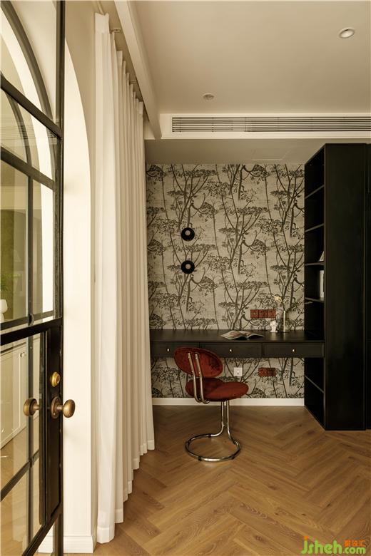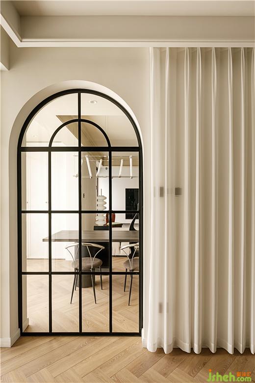 原有臥室,暫時規(guī)劃為多功能房間,供男業(yè)主做獨立書房使用,我們希望書房必要太閉塞,盡量保證空間通透感,所以將兩側(cè)墻面非承重區(qū)域打通,家裝設(shè)計保證最大化采光與通風(fēng)條件,用“老鋼窗”隔而不斷,鐵藝材質(zhì)加上弧形門洞造型結(jié)合,古典氣息濃郁,同時預(yù)留了窗簾,保留臥室居住屬性。