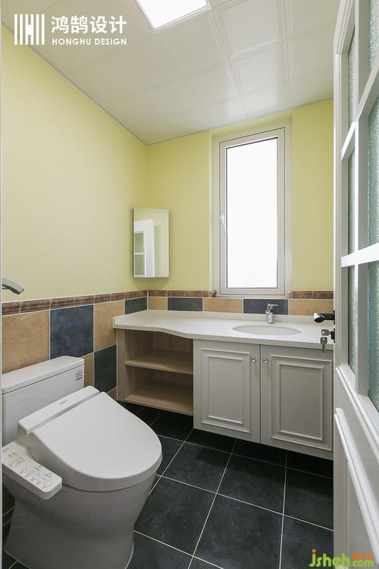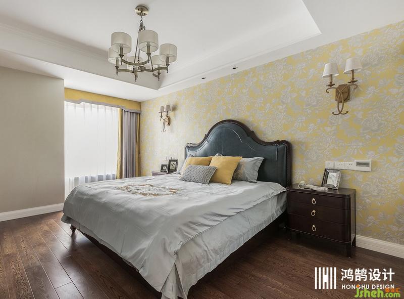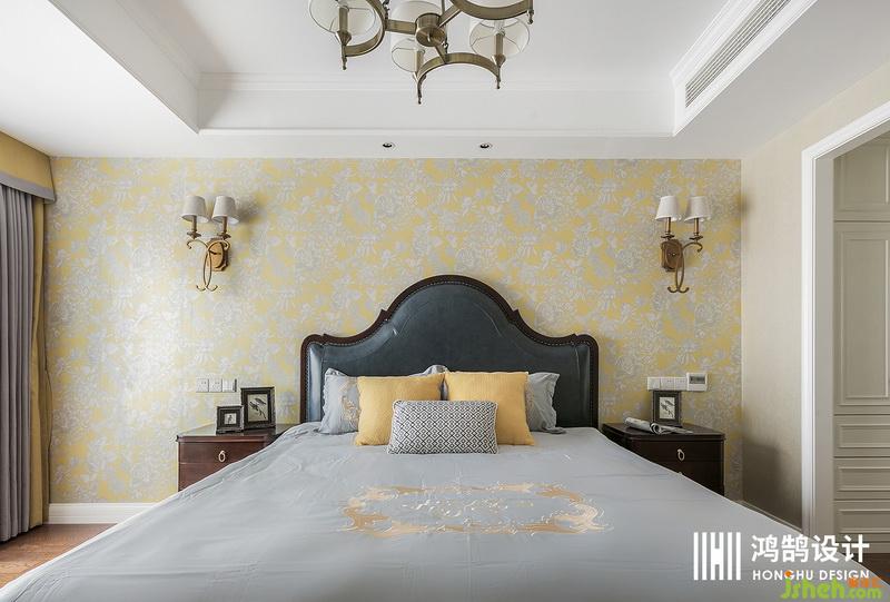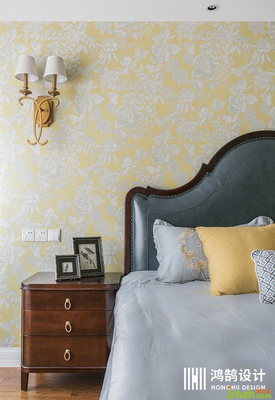 床頭背景采用高貴的明黃色墻紙與寶藍(lán)色的皮床做一個(gè)搭配,相應(yīng)的內(nèi)衛(wèi)也就采用了黃色乳膠漆和藍(lán)色半高瓷磚作為衛(wèi)生間的一個(gè)搭配。