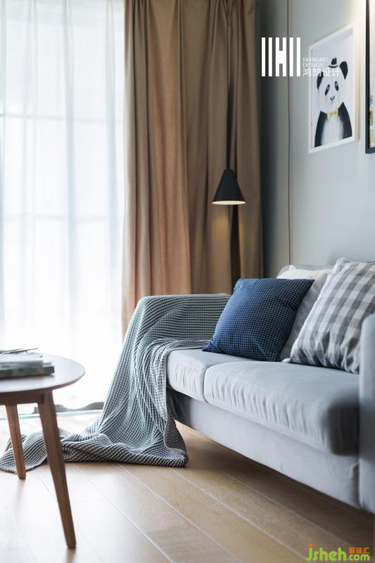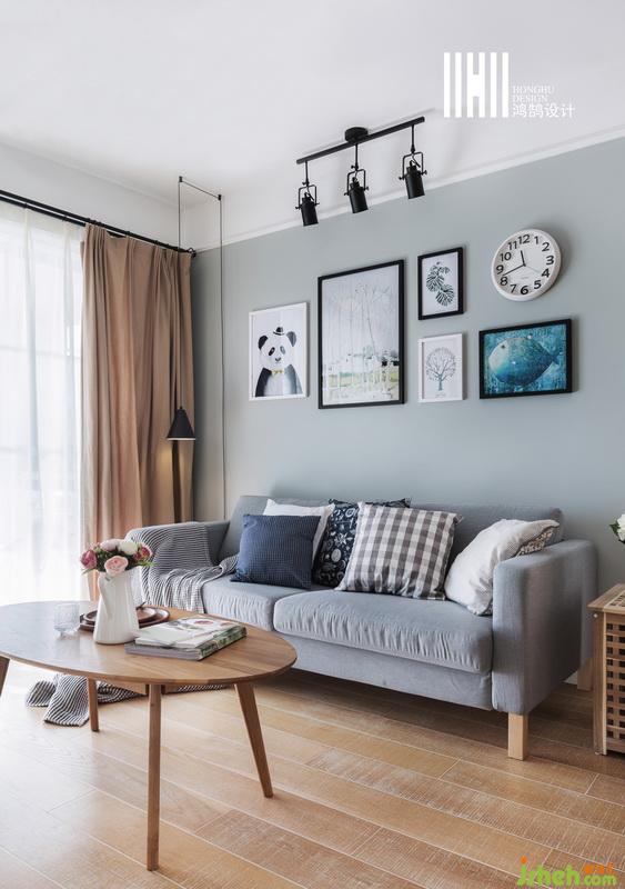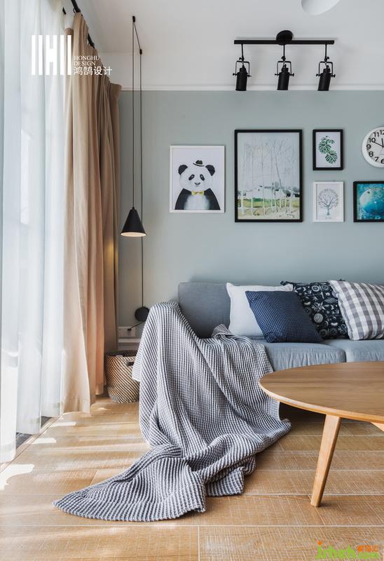 室內(nèi)設(shè)計(jì)師將藍(lán)灰色的墻面空間,木色地板和茶幾,灰色的布藝沙發(fā)搭配灰色毛毯,背景上一組裝飾畫,整個(gè)空間簡(jiǎn)單又清新。