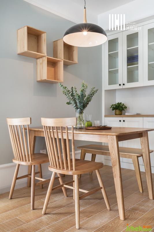 室內(nèi)設(shè)計(jì)師將原木色的餐桌、餐椅與同系列的長(zhǎng)凳搭配使用,為空間增添溫暖感,白色的入墻式餐邊柜,可以滿足日常收納的需要。