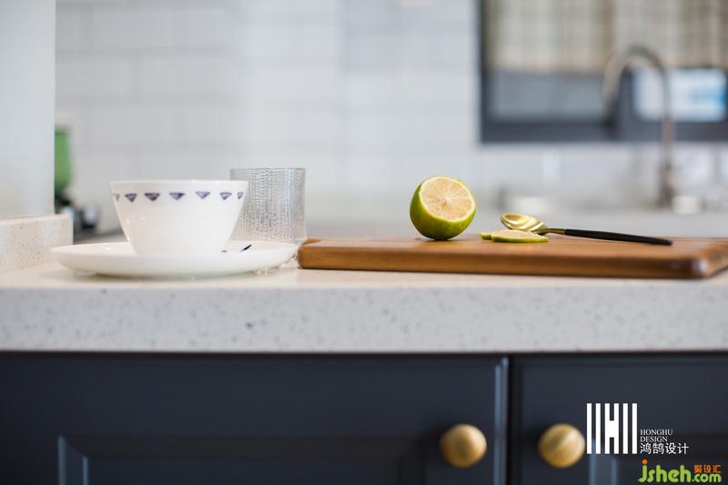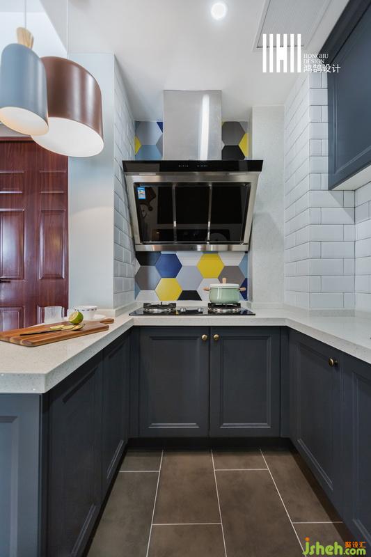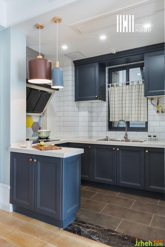 室內(nèi)設(shè)計(jì)師設(shè)計(jì)開放式的廚房,擁有了充足的操作臺(tái)面和儲(chǔ)存空間,使空間更顯開闊,墻面小白磚鋪貼配上藏青色櫥柜、白色的臺(tái)面,顏值爆表。