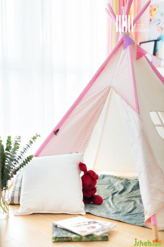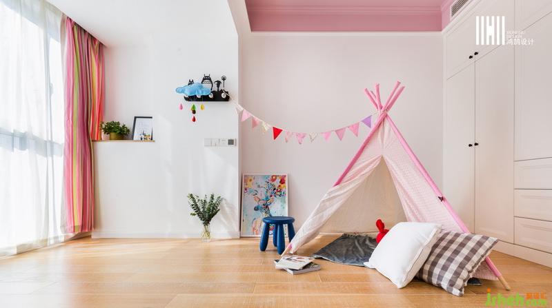 兒童房較為粉嫩,粉色小帳篷的創(chuàng)意設(shè)計(jì),童趣滿滿,給孩子更多的想象空間,一整面墻的衣柜,滿足日常儲(chǔ)物需要。