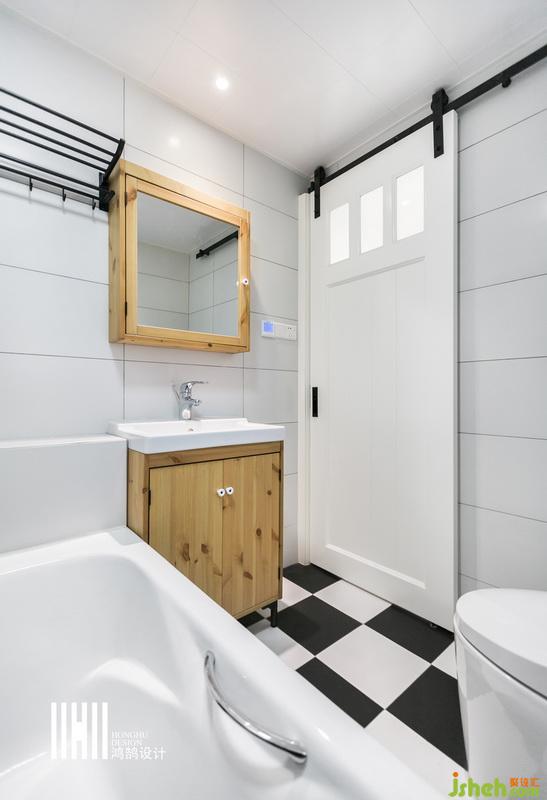 室內(nèi)設(shè)計(jì)師設(shè)計(jì)衛(wèi)生間以白色為主,白色墻面、黑白格子地面搭配原木色浴室柜,簡潔清爽。