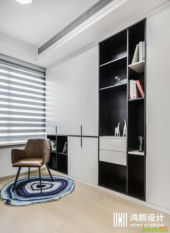 臥室的整體色調(diào)從黑白灰抽離出來,配上皮質(zhì)的淺咖色,讓整個房間充滿了品質(zhì)感。玫瑰金色的吊燈,融入房間,流露出濃濃的幸福感。