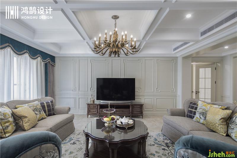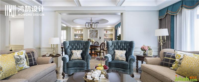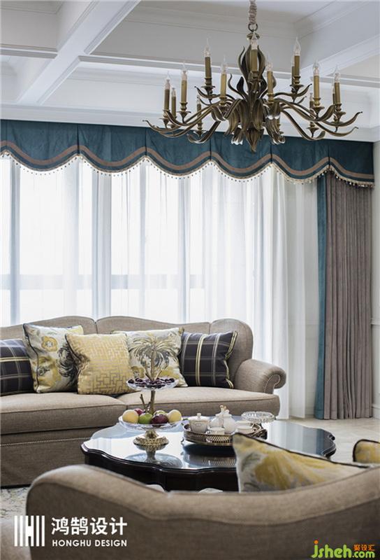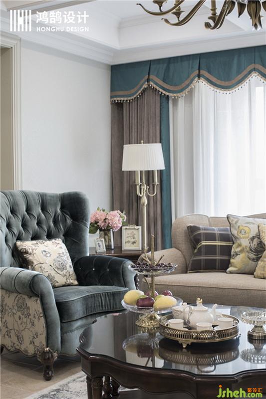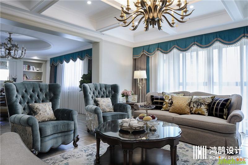 設計公司 用絲絨藍和復古金屬吊燈搭配,刻畫出濃厚的美式氛圍,布藝材質沙發(fā)搭配淺色地磚,也讓整體空間變得明亮。