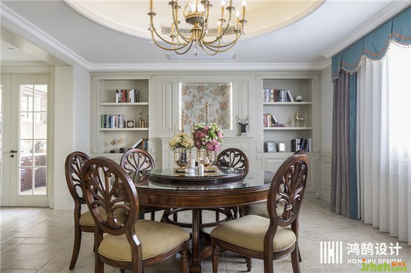 圓形復古餐桌,與圓形吊頂相呼應,給予餐廳一份浪漫的就餐氛圍。