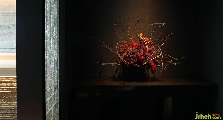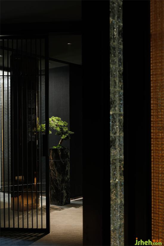 入口處,定調(diào)幽深,從外部看低調(diào)而神秘,褪去了街道上車水馬龍的煙火氣;日料餐廳設(shè)計前景處一棵造型窈裊的松樹盆景則為這份當(dāng)下的力量注入一縷高古的幽邃,讓人的心也隨之滌清濾凈。
