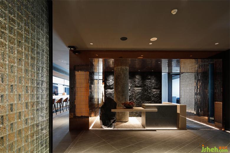 吧臺側(cè)面,不規(guī)則的原石形態(tài),日料餐廳設(shè)計以敦實厚重的體積和自然的紋理,為空間注入深刻的能量,簡潔而有力度,長形的臺面使客人在此感受空間的延伸感,流動的空間在這里或停滯或奔騰。