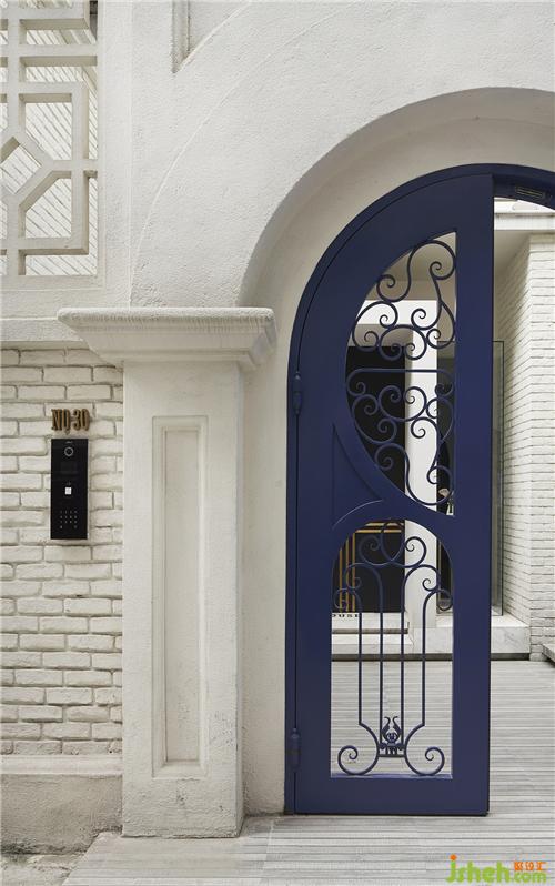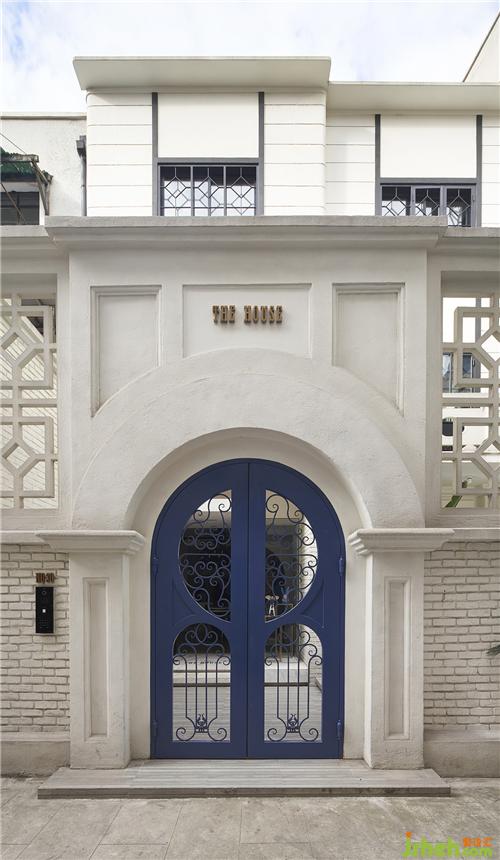 THE HOUSE在弄堂內(nèi)一眾傳統(tǒng)的老房子中十分醒目,大概源于她的摩登現(xiàn)代風(fēng)格。原本封閉的大門被夾有通透感的雕花處理,室內(nèi)設(shè)計(jì)師以明亮的藍(lán)色提升現(xiàn)代感,周圍墻面和門楣采用仿石材的真石漆來翻新,表面的顆粒感和淺色的暖色調(diào)讓整個(gè)建筑外觀顯得優(yōu)雅不失簡約,細(xì)膩而貼近自然。