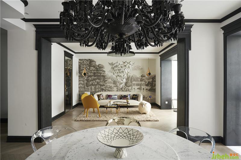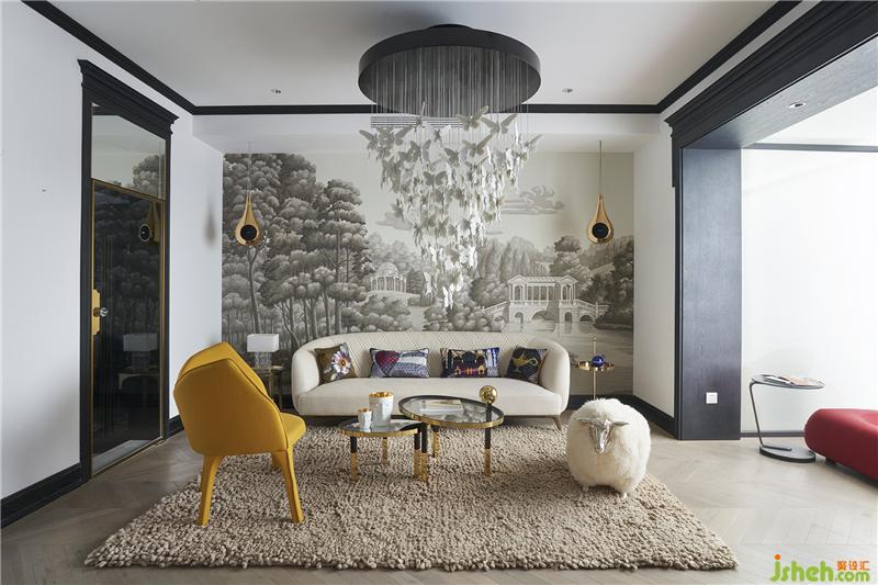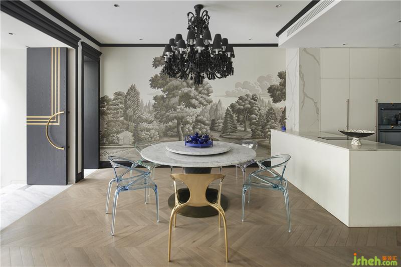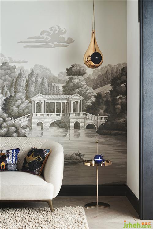 于是可以看到,一樓會客廳來自意大利Garvan的水滴形音響和背后的de Gourney 風(fēng)景壁紙構(gòu)成了一副令人遐想的畫卷。坐在這里就好像在森林里聽音樂藝術(shù)吊燈上如瀑布般垂吊的小精靈閃爍的光芒,而靈感就開始在心里的某個(gè)角落萌發(fā)……