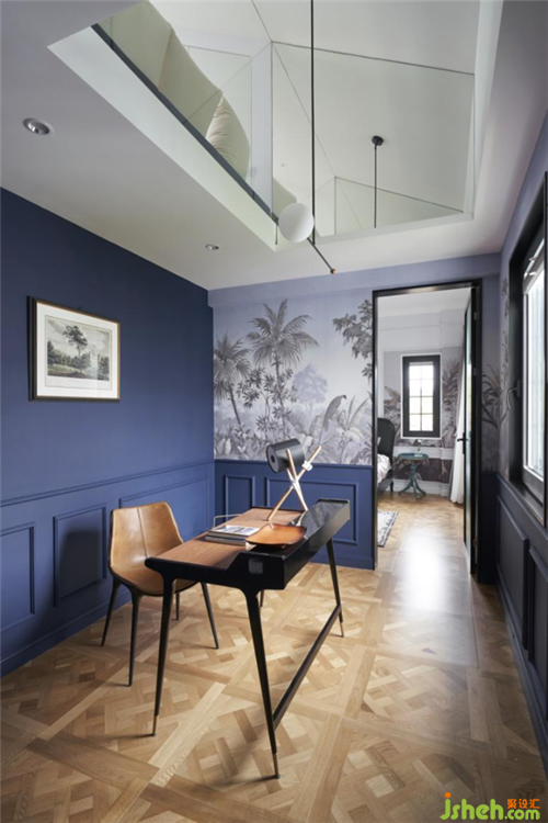 整體色彩上運用了代表時尚和尊貴的法式高級藍,增加藝術(shù)感,形式上大量利用了壁紙,將自然藝術(shù)型的壁紙代入到空間之內(nèi),別墅裝飾將自然融入到室內(nèi),將室內(nèi)外相呼應(yīng),通過藝術(shù)的手法,使盡管在大城市的上海也能感受到自然的氣息。使護墻板、暗門、壁紙、線條的相互碰撞融合,充滿了對生活的熱愛和追求。
