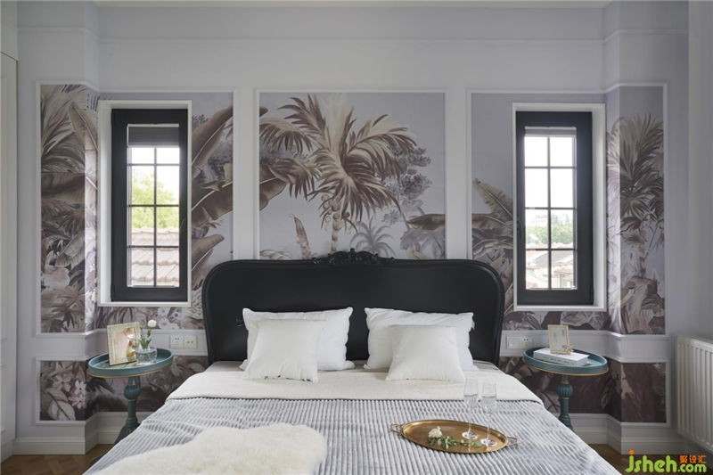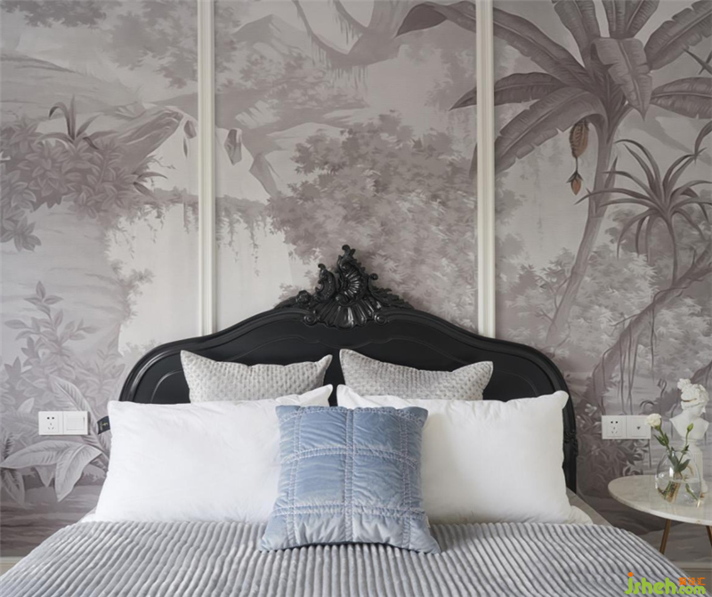 明麗的家具與藝術(shù)蓬勃才是喚醒生命的真正力量。床品使用古典的雕花形式但是用了現(xiàn)代的手法,整體黑色的色調(diào)與后面的自然景觀的壁紙形成了呼應(yīng)。