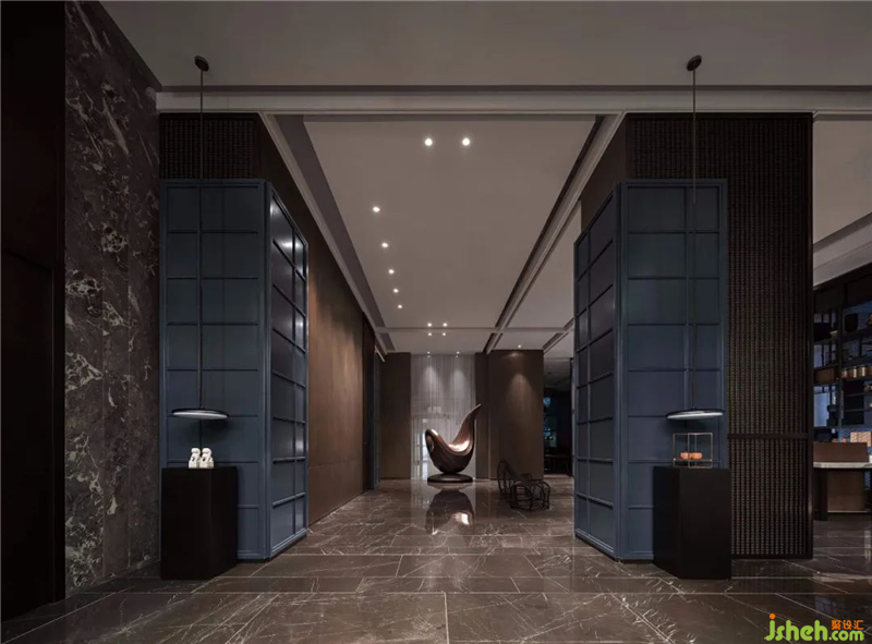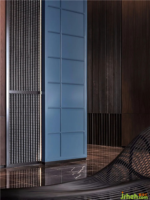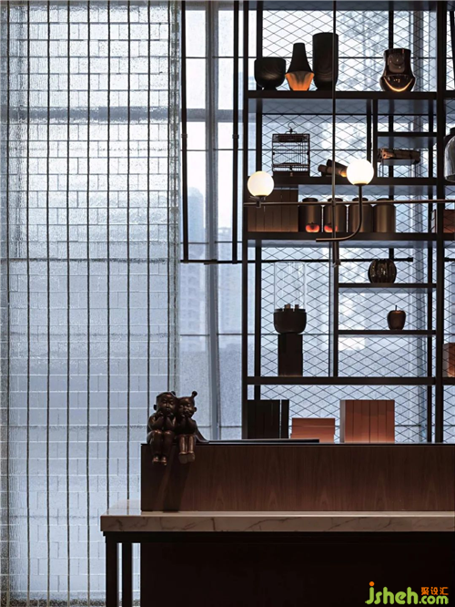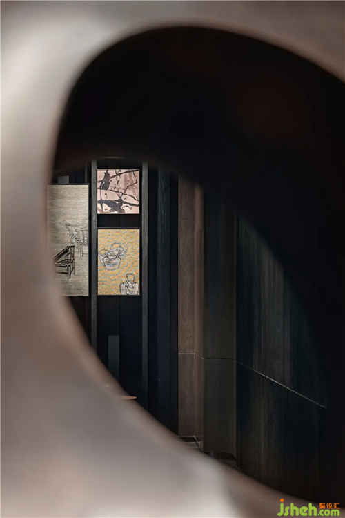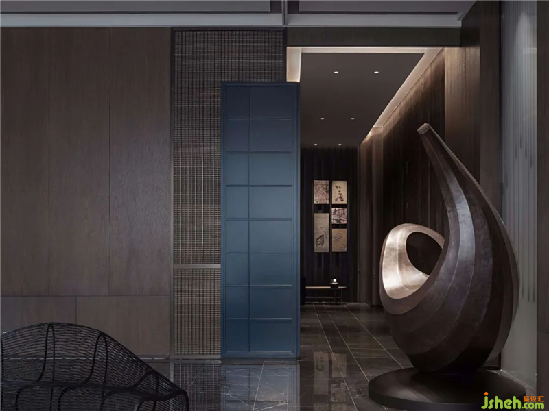 波浪形的鐵藝長(zhǎng)凳為空間植入律動(dòng),結(jié)合兼具美感與實(shí)用性的雕塑“泉”與“福鼎”。與在此稍作歇息的賓客一同打造出大堂“人、壺、泉”相融的茶道意境,讓賞景人亦成景中客,藝術(shù)本就藏于生活的點(diǎn)滴之中。