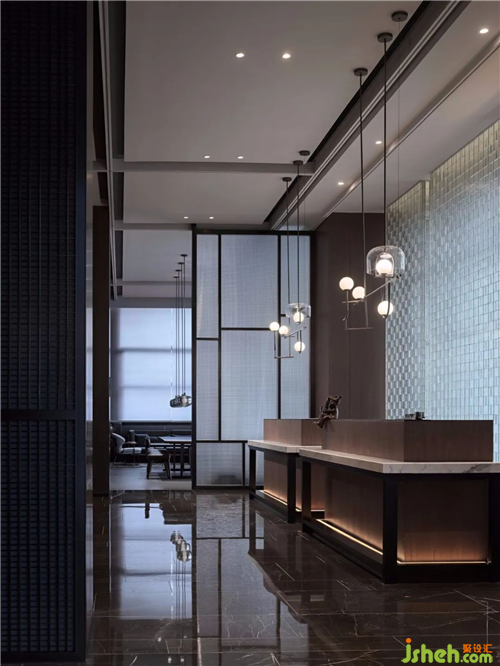 前臺(tái)以大塊面木飾面為空間基調(diào),接待臺(tái)以方正對(duì)稱形簡(jiǎn)而精,酒店設(shè)計(jì)空間轉(zhuǎn)折面運(yùn)用玻璃材質(zhì)伴有猶抱琵琶半遮面之朦朧感,在增加空間通透性為室內(nèi)與室外形成一定的交融與互動(dòng),大地色系底色的延續(xù)深厚的人文底蘊(yùn)。