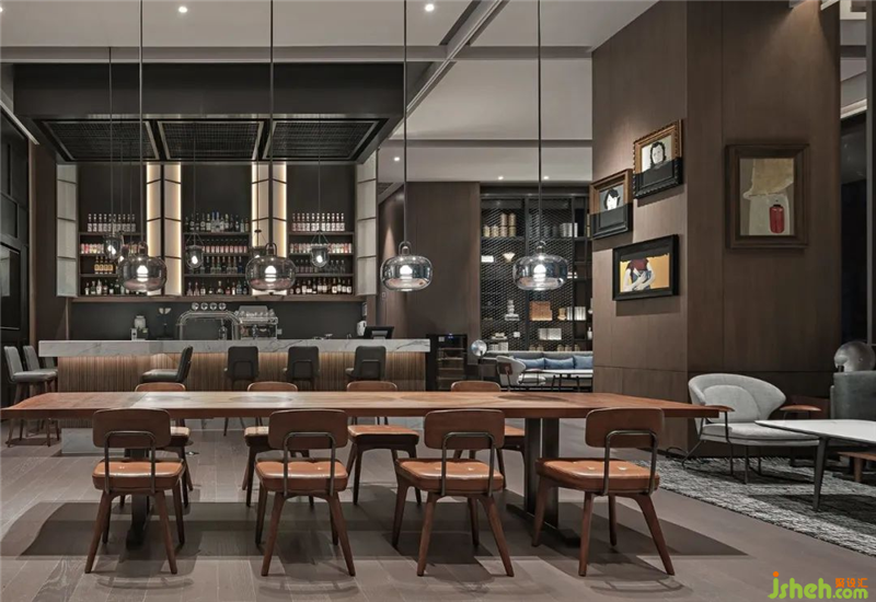 大堂側(cè)面的HOLA bar打造了一個(gè)集咖啡、精釀、文化等現(xiàn)代生活方式于一體的多元共享社交空間,是商務(wù)、休閑、移動(dòng)辦公的個(gè)性之選。設(shè)計(jì)融合了工業(yè)型格與復(fù)古輕奢創(chuàng)意元素,將復(fù)古重現(xiàn),結(jié)合當(dāng)?shù)爻啥嘉幕?,以小景?xì)節(jié)呈現(xiàn),打造輕松現(xiàn)代感的社交場所,為“旅享家”打造新型社交體驗(yàn)。