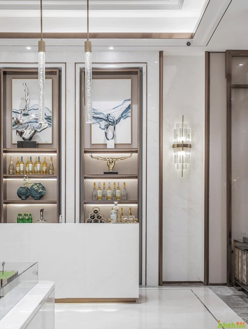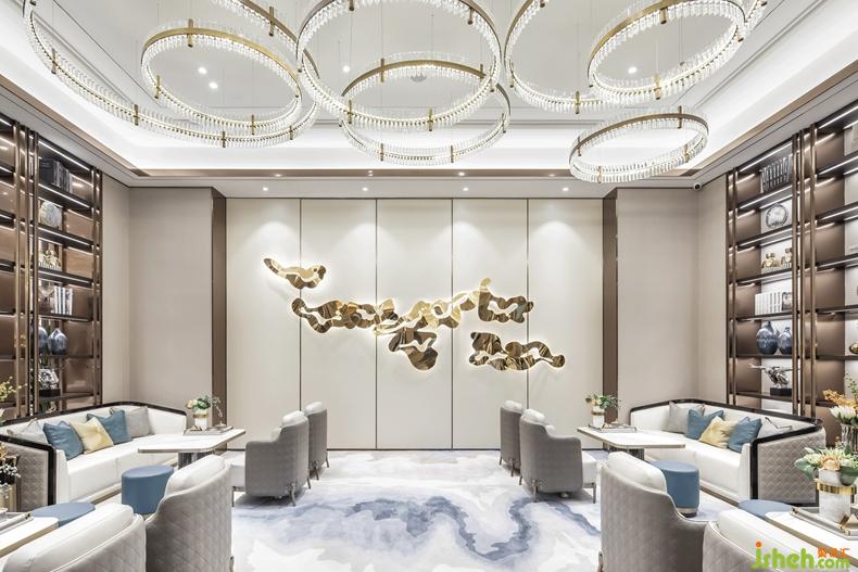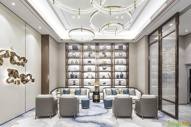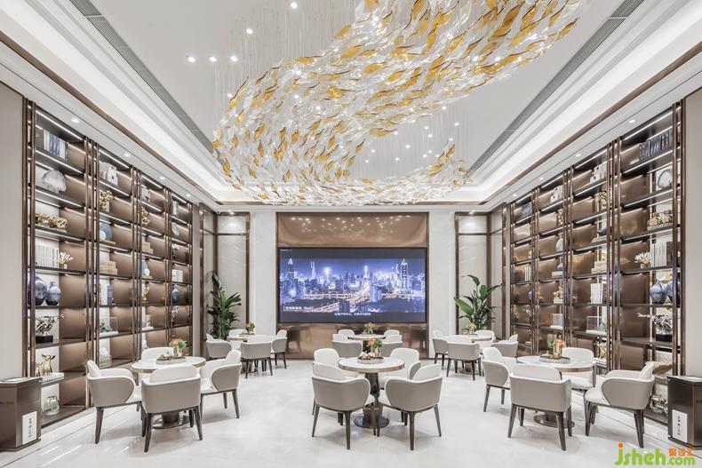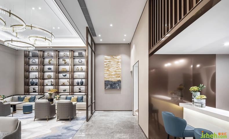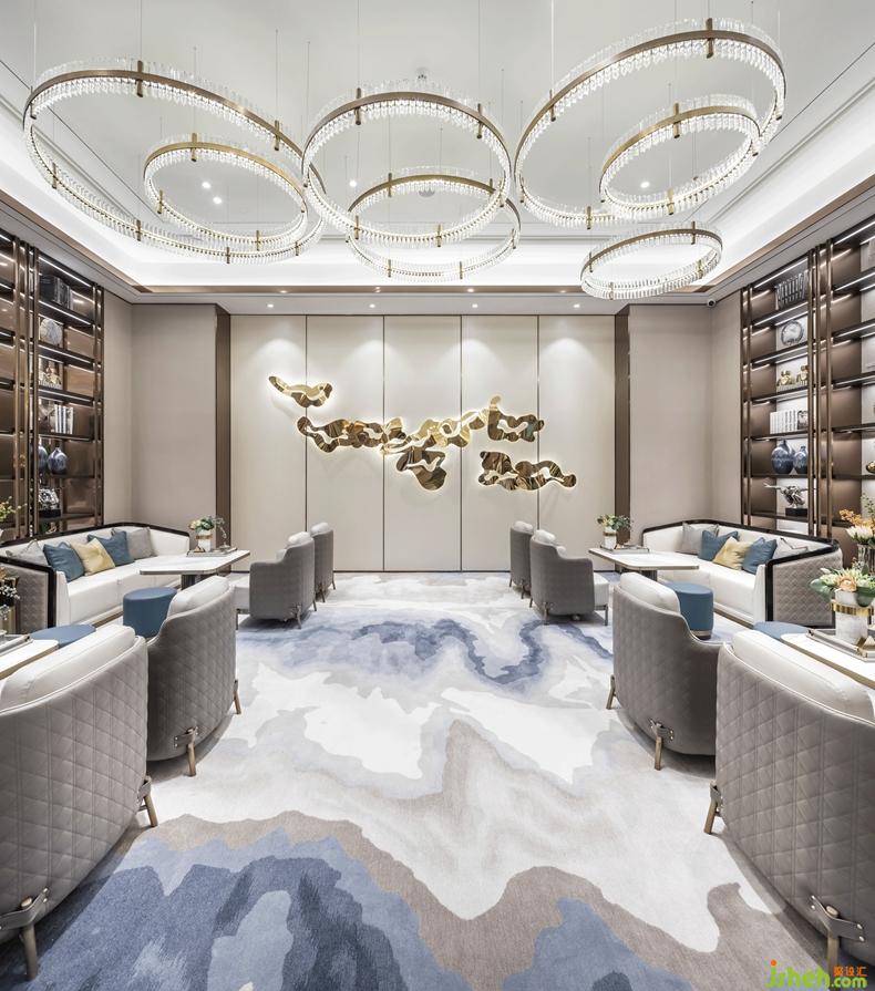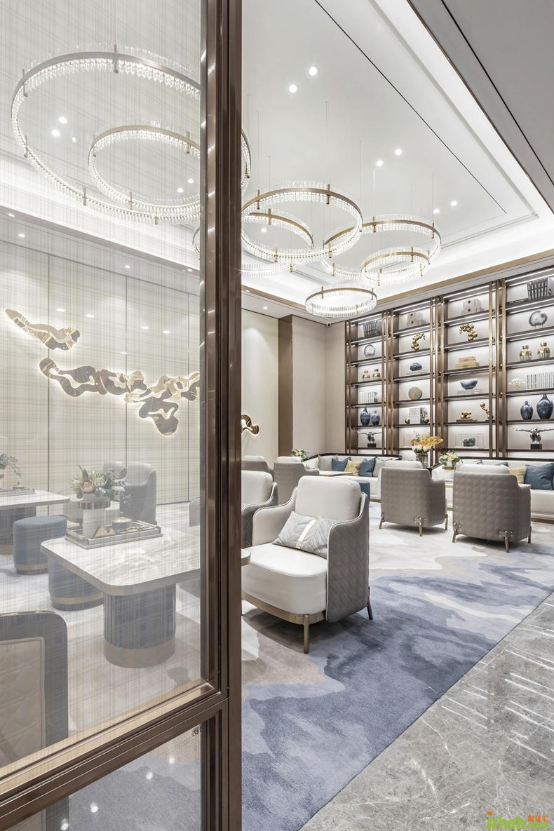 跟隨著“水”元素的蹤跡來到通透明亮的VIP私人洽談區(qū),以水藍(lán)色為主的優(yōu)雅色調(diào),以極其平緩而雅致紋路溢出了動(dòng)與靜、虛與實(shí)的意蘊(yùn)。人們交談?dòng)诖?,水晶燈低調(diào)而奢華的造型閃爍出淡淡光華,室內(nèi)設(shè)計(jì)師渲染出一個(gè)未來可期的生活空間。