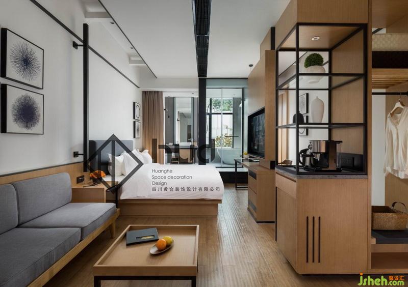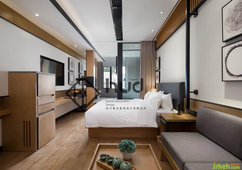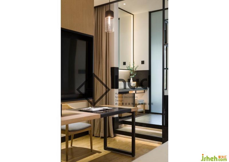重構為裝飾要素的功能體同時還帶來了另一重高妙意境——“之間”的概念。何為“之間”?字面釋義:“兩者的中間”,即在平面規(guī)劃時,講求“空”與“隔”的營造。于是我們看到,重構后的電視墻、迷你吧、衣柜等原本慣于依附墻體,可用做立面裝飾而存在的功能體,皆從墻面抽離開來,獨立于空間容器內部,或懸空或游離,與原始建筑結構柱體、墻體間形成了大小各異、寬窄并行的通道空間,打破了傳統(tǒng)酒店單一呆板的格局,又為并不寬敞的空間增加了錯落與層次感,從而避免了直白的通視。