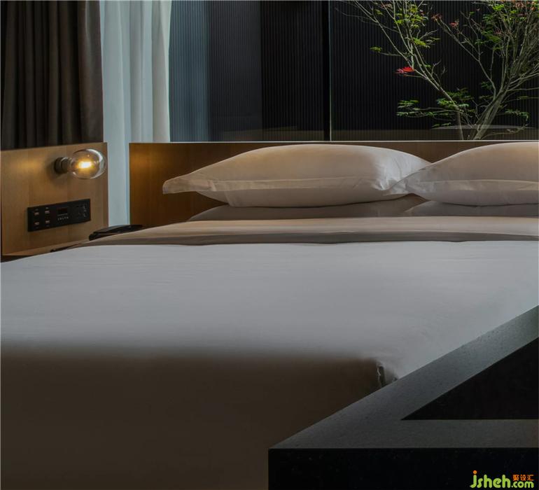 花園地面大面積采用黑色石鋪地與室內(nèi)的黑色地磚形成延續(xù)、設(shè)計師酒店設(shè)計通過點綴少量的疊石,苔蘚、紅楓。營造出小巧、靜謐、精致的戶外空間。
