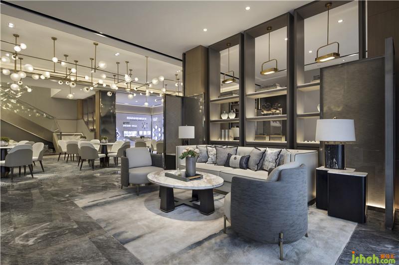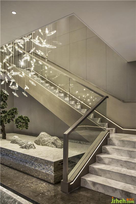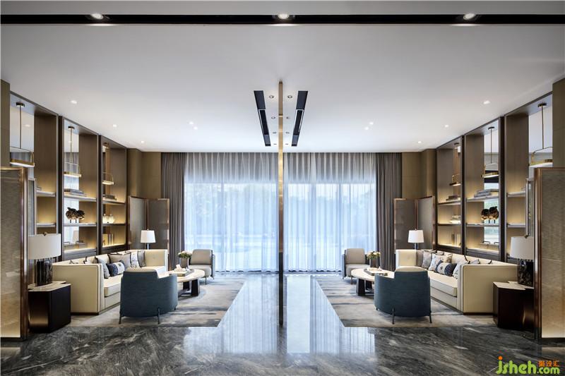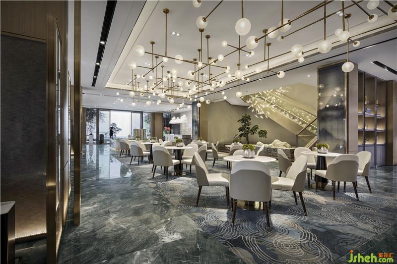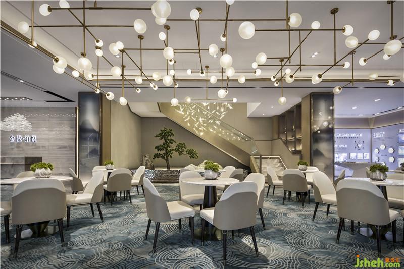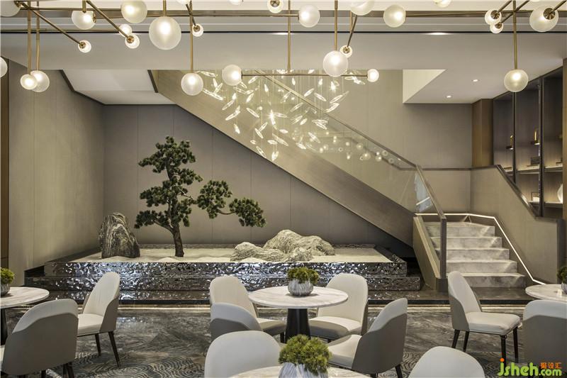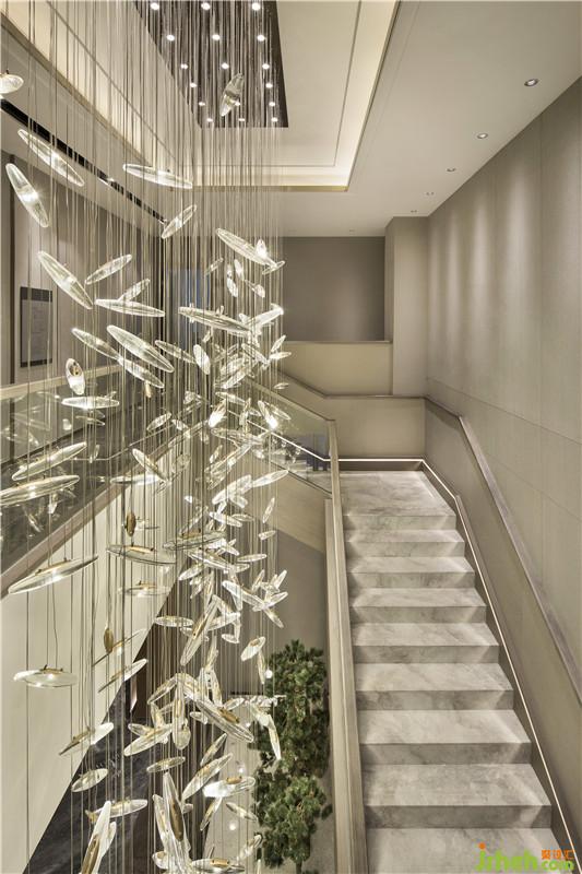 “萬丈洪泉落,迢迢半紫氛。奔流下雜樹,灑落出重云。日照虹霓似,天清風(fēng)雨聞。靈山多秀色,空水共氤氳?!便y泉飛瀑跌宕而下,鏗鏘有力,疾風(fēng)驟雨,亦真似幻。騰空而起的縹緲?biāo)畾猓瑹熿F繚繞,一派迷蒙與虛無之境。“天地氤氳,萬物化醇”,提取廬山瀑水之韻、之形、之氣、之神,鋪灑在空間各個角落,孕育乾坤交合的生命意境。設(shè)計(jì)公司