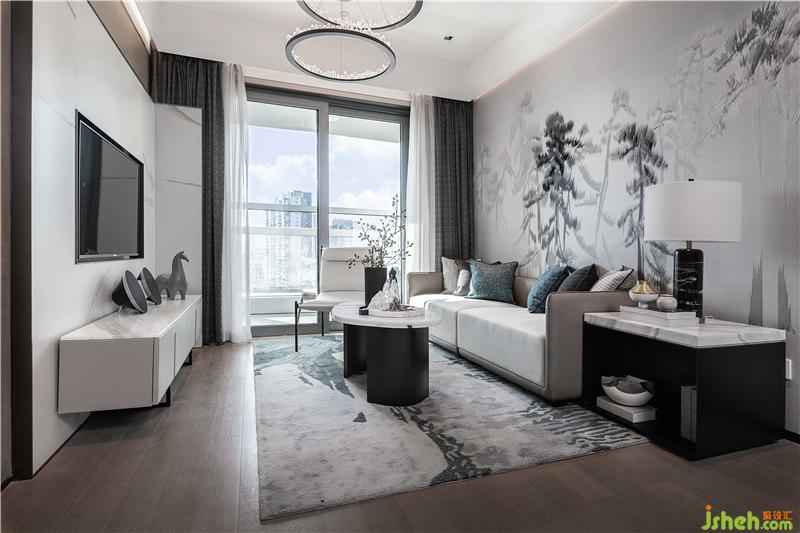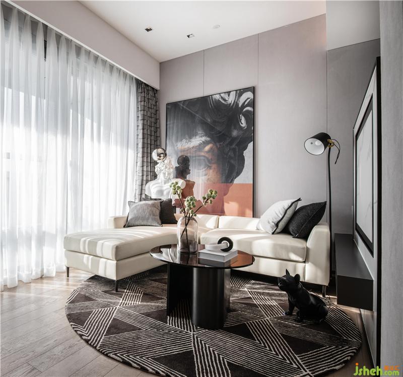 L型的沙發(fā)圍合成客廳,淺色布藝搭配深色地毯,明暗對比,不失穩(wěn)重。圓環(huán)玻璃茶幾呼應圓形切割地毯,流露一種圓融柔和的美好生活希冀。