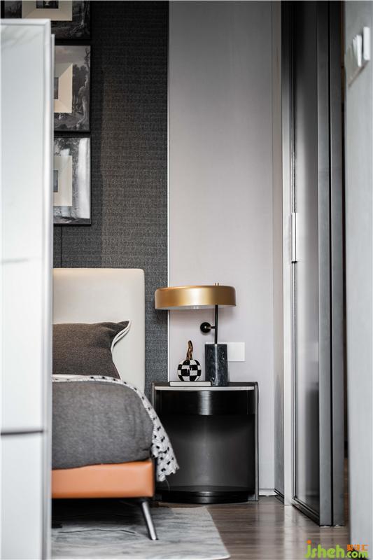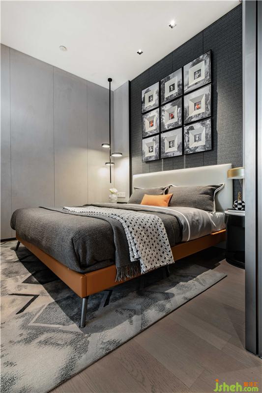 臥室床榻與抱枕的愛馬仕橙色輝映成趣,成為無法忽略的視覺焦點,點亮了整體空間的生氣。