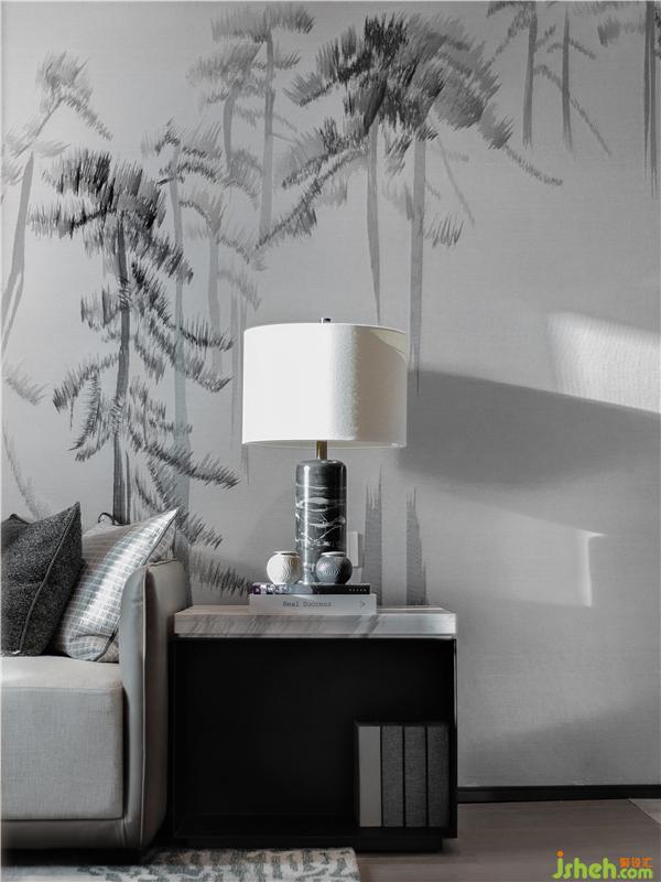 客廳設(shè)計優(yōu)雅大氣,簡潔高級。視線焦點(diǎn)處,松林手工刺繡墻布遠(yuǎn)看如山巒起伏,深淺明滅,抽象寫意,力透紙背的東方情懷。