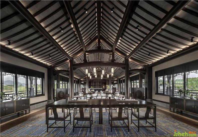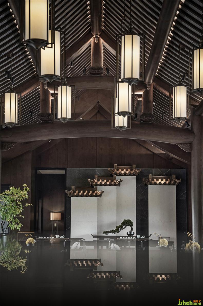 步入接待大堂,上方的冬瓜梁造型十分搶眼,視野縱深有屋瓦如鷹羽排序,橫向處有象征財(cái)富和棟梁之才的冬瓜梁(又名:元寶梁)充室盈屋,一縱一橫,大開大闔。