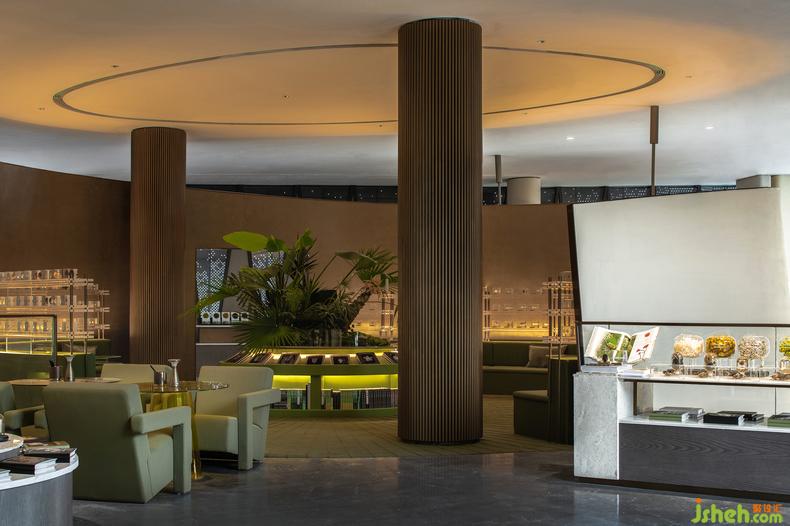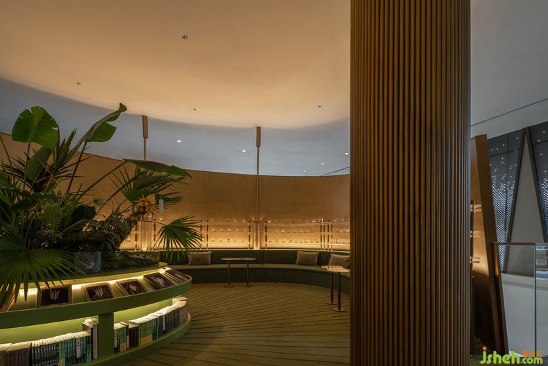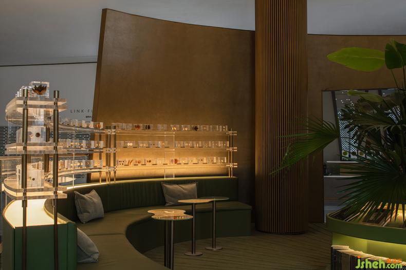 矮櫻的柔嫩、香薊的堅(jiān)毅、銀杏的治愈......亞克力壓印的葉片標(biāo)本,在局部燈光的映照中,將人們游覽的視線聚焦。復(fù)古的墨綠色調(diào)與黃銅材質(zhì),連通整體空間的設(shè)計(jì)語言,在此刻,獨(dú)享時(shí)光的靜妙。