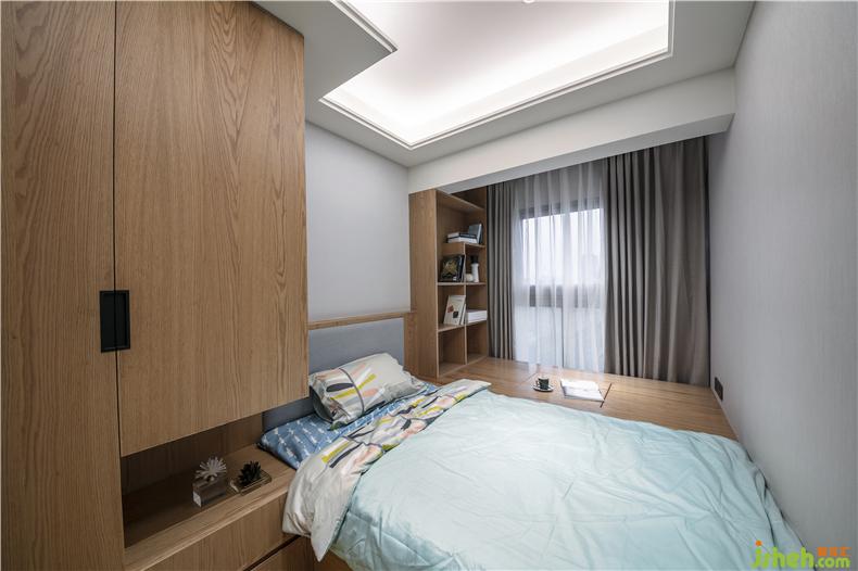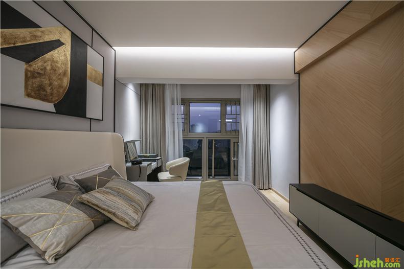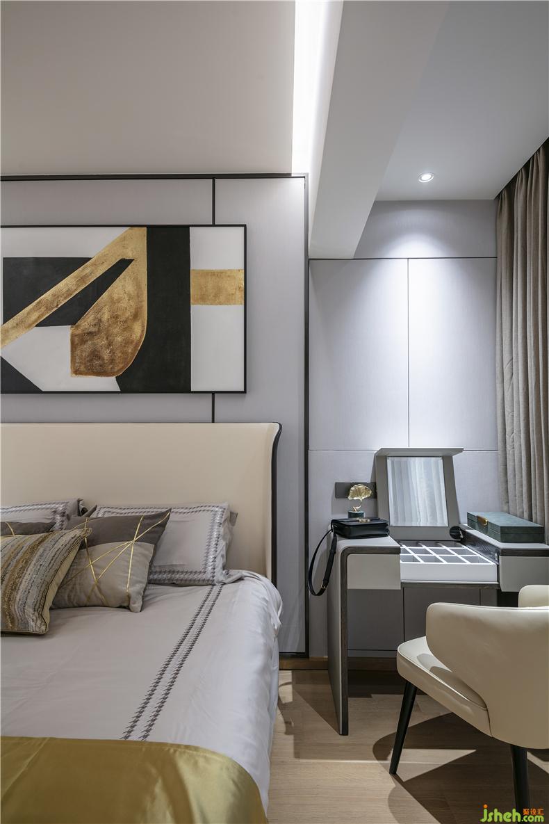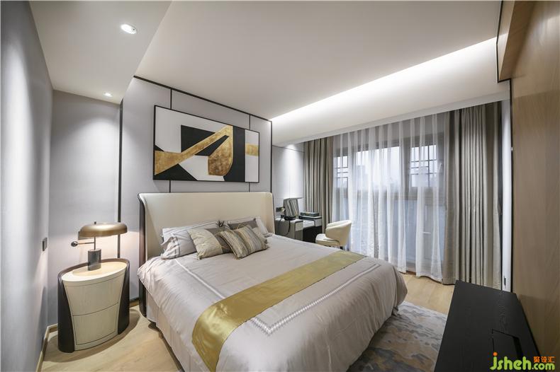 Junmei design - ascension design case hides the scenery in the house and the owner's bedroom. Gray and yellow are classic and eternal fashion. The changing scenery outside the window makes fashion never out of fashion.