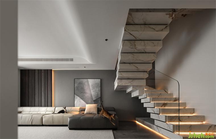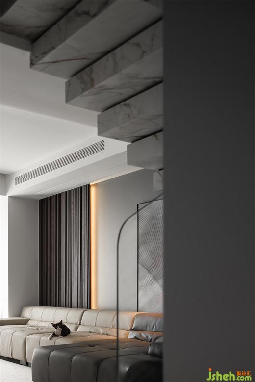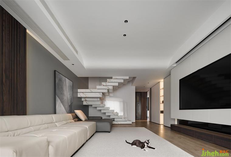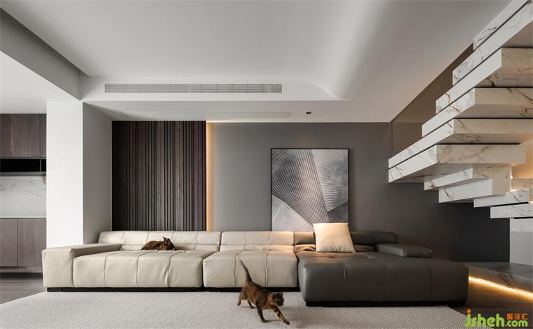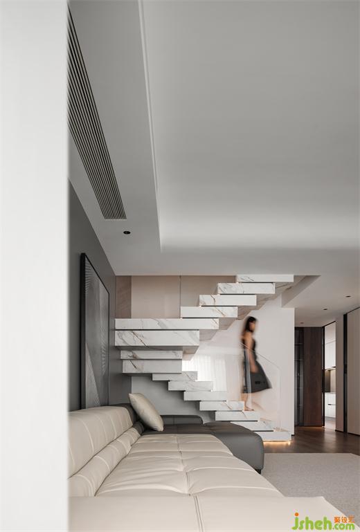 遵循簡約而低調(diào)的設(shè)計手法,復(fù)式豪宅設(shè)計用大面積的白色來詮釋宅家的靜謐與安然,削減空間的厚重感。